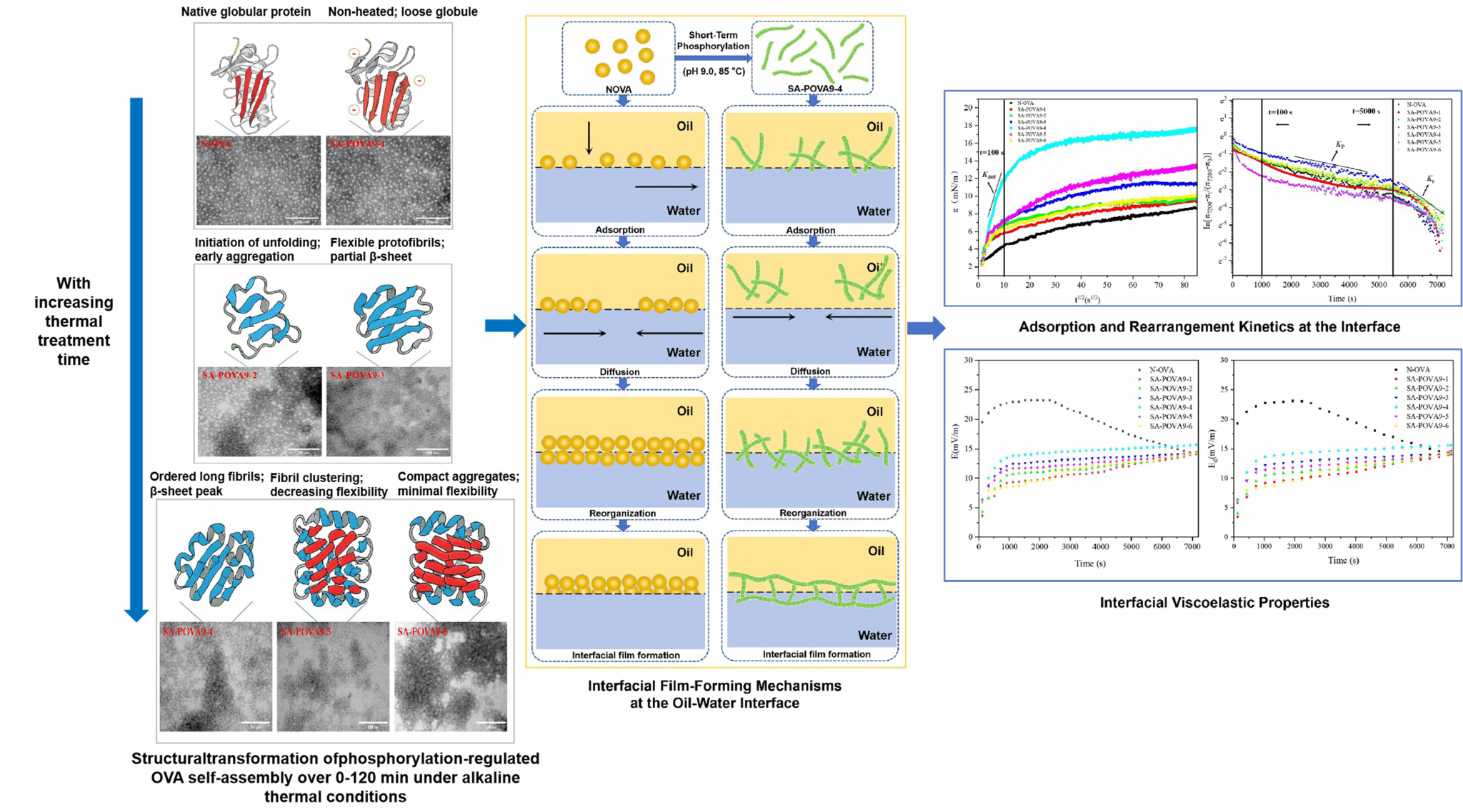 2025年8月,我院肖珊教授团队于国际食品顶级期刊《Food Hydrocolloids》(IF = 12.4)在线发表题为“Short-Term Phosphorylation Regulates Ovalbumin Self-Assembly into Functional Aggregates at the Oil-Water Interface: Structural Transformation and Interfacial Film-Forming Mechanisms”的研究性文章。论文第一作者为熊舟翼特聘副研究员,共同通讯作者为肖珊教授。