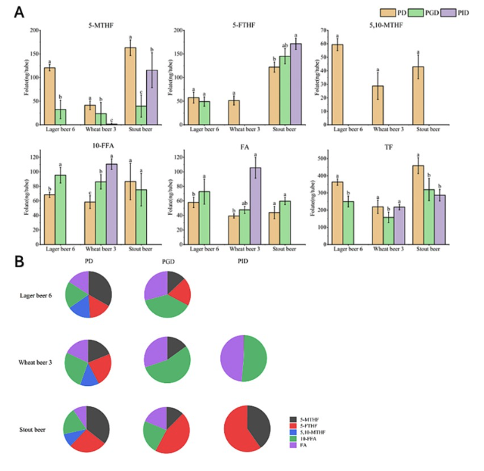 本研究采用超高效液相色谱-四极杆飞行时间串联质谱法(UHPLC-Q-TOF-MS/MS)对市售啤酒中的叶酸含量及稳定性进行了研究。研究表明,16种市售中国啤酒中总叶酸含量在35.0至199.6微克/升之间,其中5-甲基四氢叶酸(5-MTHF)为主要形式(占21% 至70%)。主成分分析显示,不同啤酒类型之间存在明显的聚类模式,且酚类含量与叶酸水平呈正相关。在体外消化过程中,酚类含量较高的啤酒表现出还原型叶酸更强的稳定性,尤其是黑啤,其酚类含量为493毫克GAE/升。在加速储存条件下(60℃,10天),所有样品的叶酸含量均显著下降,而酚类含量各不相同。尽管储存期间总酚类含量保持稳定,但所有样品的抗氧化能力均持续下降,这表明保护机制可能比单纯的抗氧化活性更为复杂。这些发现为啤酒基质中叶酸与酚类的相互作用及其在加工和储存过程中营养品质的保持提供了重要的参考价值。