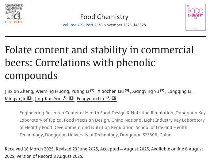 2025年8月,我院硕士研究生郑锦贤以第一作者身份于国际食品顶级期刊《Food Chemistry》(IF = 9.8)在线发表题为“Folate content and stability in commercial beers: Correlations with phenolic compounds”的研究性文章。我院刘丰源助理研究员和闫景坤教授为该论文共同通讯作者。