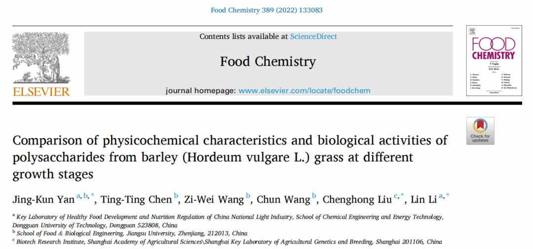 2022年4月,东莞理工学院食品营养健康工程与智能化加工研究中心闫景坤教授(第一作者)在国际食品顶级期刊《Food Chemistry》(IF: 9.231, Q1)发表了题为“Comparison of physicochemical characteristics and biological activities of polysaccharides from barley (Hordeum vulgare L.) grass at different growth stages”的研究论文。