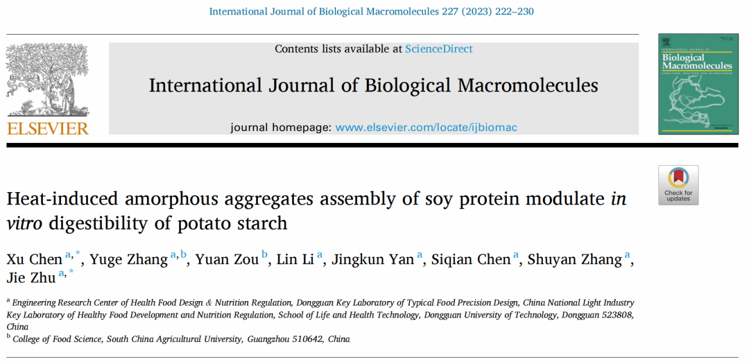 2022年12月,东莞理工学院食品营养健康工程与智能化加工研究中心陈旭博士(第一作者兼通讯作者)和朱杰副教授(通讯作者)在国际食品顶级期刊《International journal of biological macromolecules》(IF: 8.025, Q1 TOP)发表了题为“Heat-induced amorphous aggregates assembly of soy protein modulate in vitro digestibility of potato starch”的研究论文。