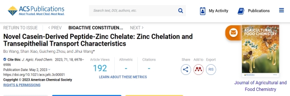 2023年5月2日,我院王际辉教授团队在国际食品顶级期刊《Journal of Agricultural and Food Chemistry》在线发表题为“Novel Casein-Derived Peptide-Zinc Chelate: Zinc Chelation and Transepithelial Transport Characteristics”的研究性文章。论文第一作者为王波特聘副教授,通讯作者为王际辉教授。