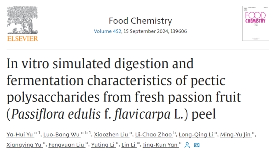 2024年5月11日,我院闫景坤教授团队于国际食品顶级期刊《Food Chemistry》在线发表题为“In vitro simulated digestion and fermentation characteristics of pectic polysaccharides from fresh passion fruit (Passiflora edulis f. flavicarpa L.) peel”的研究性文章。论文第一作者为于亚辉博士,通讯作者为闫景坤教授。