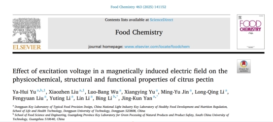 2024年9月6日,我院闫景坤教授团队于国际学术期刊《Food Chemistry》(中科院JCR 1区)在线发表题为“Effect of excitation voltage in a magnetically induced electric field on the physicochemical, structural and functional properties of citrus pectin”的研究性文章。论文第一作者为于亚辉博士,通讯作者为闫景坤教授。