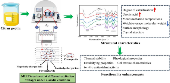 全球果胶市场规模每年超过10亿美元,预计到2025年将超过20亿美元。然而,果胶因具有分子量大、溶解性差、结构复杂等特点,限制了其在食品工业中的应用。因此,需要对果胶进行适当的结构修饰,以提高果胶的应用范围。磁感应电场技术是一种新兴的物理加工技术,能够有效改变果胶的结构,提高其功能特性。