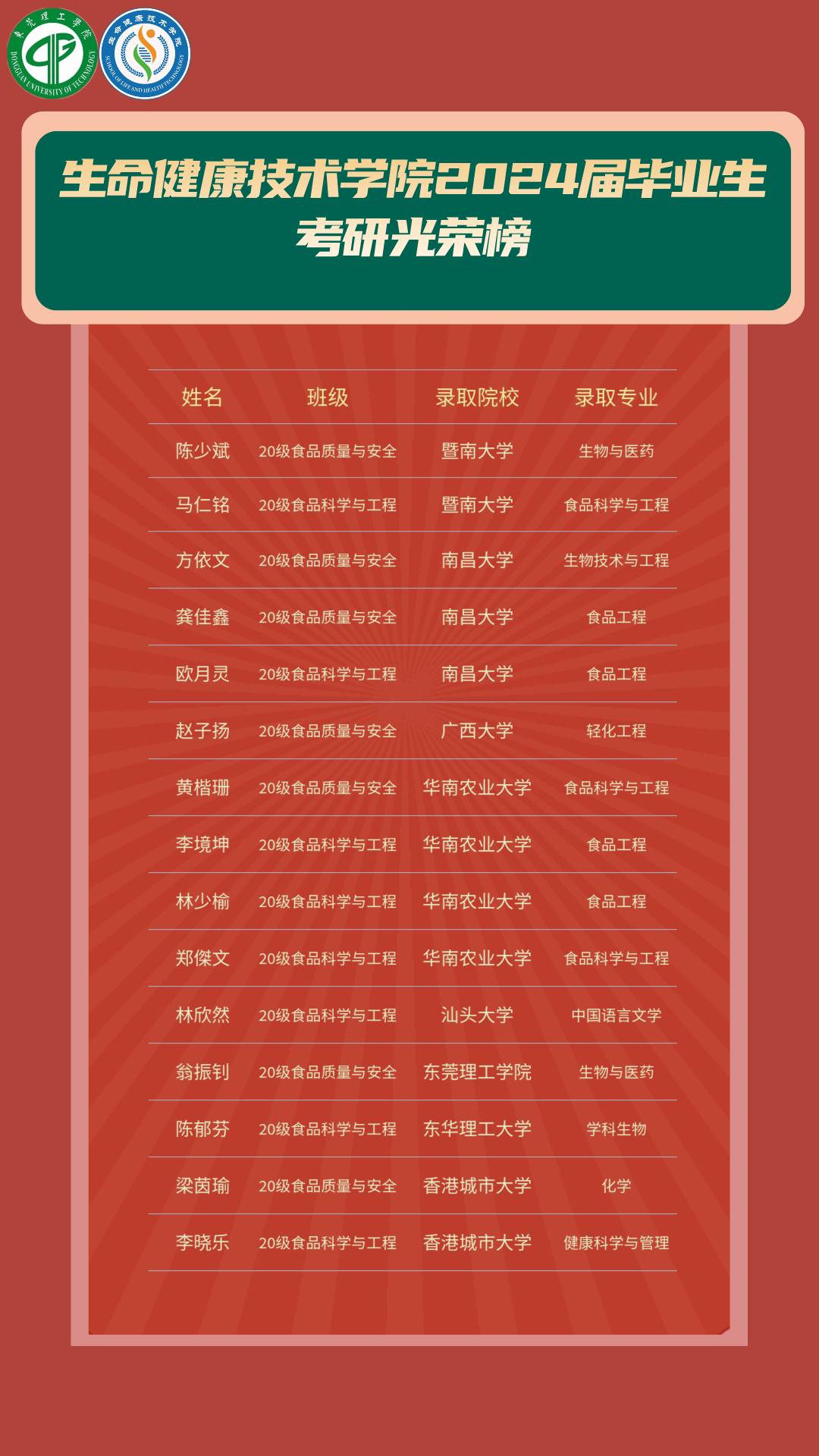 近日,3044am永利集团官网2024届毕业生考研升学捷报频传,15名同学通过努力实现了一战成“硕”的梦想,其中,有多名同学被暨南大学、南昌大学、华南农业大学等高水平大学录取。据统计,学院2024届毕业生升学率达23.44%。